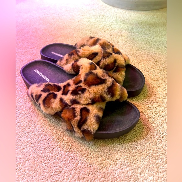 Fuzzy Leopard Slides. Size 9 but fit like a narrow 8! Worn once around the house.