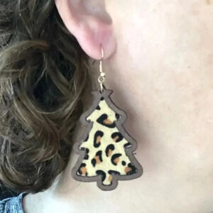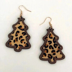 Leopard Spot Tan Beige Christmas Tree Animal Print Wooden Drop Earrings NWT