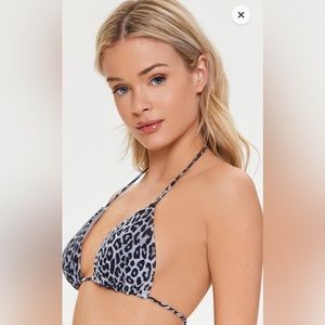 top features an allover leopard print, halter neckline, triangle silhouette, and back self-tie closures.