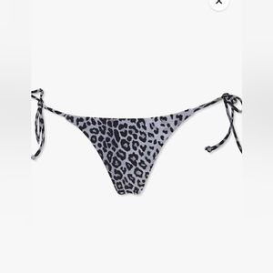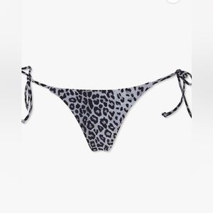 bikini bottoms features an allover leopard print, mid-rise waist, high-leg cut, string construction, and side self-tie closures.