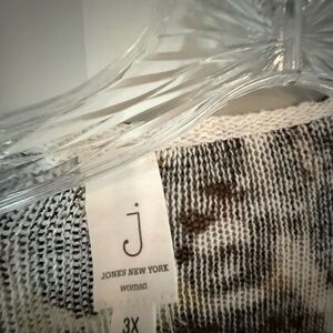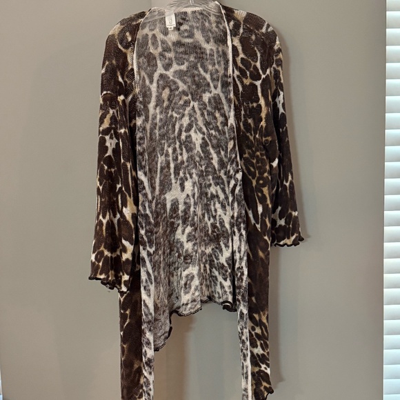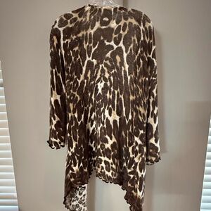 This Leopard throw sweater has a full sleeve and is higher in back for a chic look. Throw it over any top and jeans or a black pant. has 2 abstract buttons.