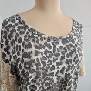 Stylish leopard print women's top featuring elegant lace sleeves. Perfect for a chic and trendy look.