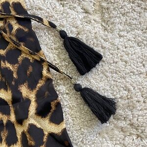 Leopard print, silky soft, wide leg pants. Thick waist band with drawstring and cute black tassels. Side pockets with a very flowy vibe to them!