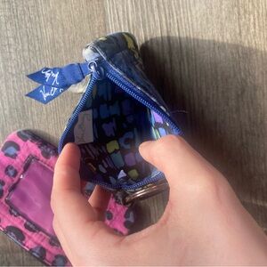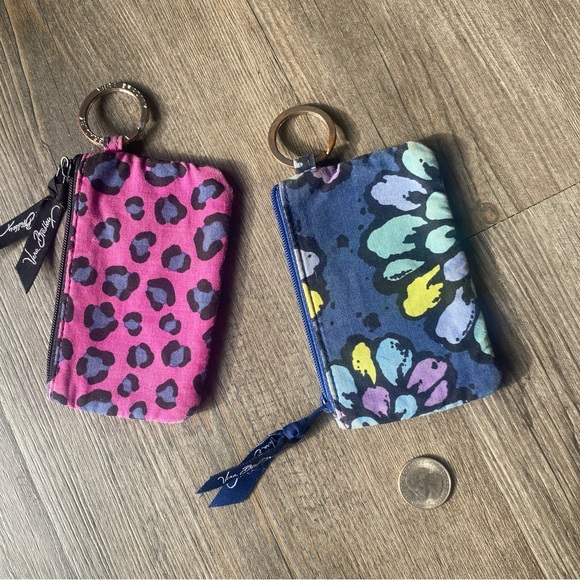 Set of two keychain pouches. One features a pink leopard print. The other has a blue floral design. Perfect for small essentials. Well used but still in great condition. Photo ID pockets