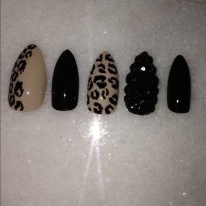 Nude with leopard design and glossy black with black rhinestone accent nail Thumb 3, Index 7, Middle 5, Ring 6, Pinky 9. Customizable size upon request