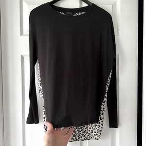 Leopard back top. Sweater material in front, slight pilling. Back is blouse material. Shorter in the front, longer in the back.