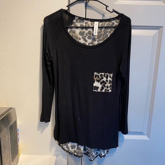 Leopard print back (sheer), with leopard print pocket on front. Hi-lo hemline, relaxed fit, tunic.