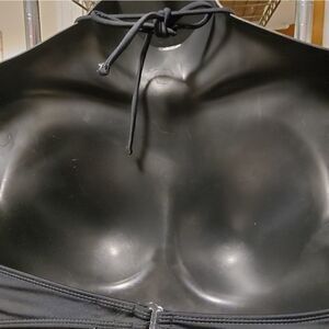 top: Ruched in the middle of the front, has a back hook. ties around the neck