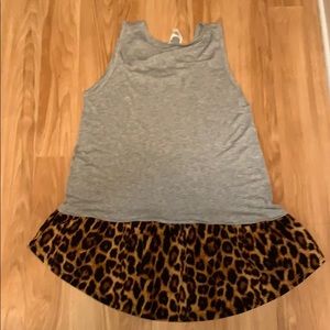 Gray upper in tee material. Leopard lower in a blend of materials. Fantastic flow. High low hem, back covers your bottom. Size small. NWOT. Purchased from Eleven Oaks Boutique.