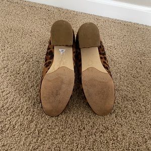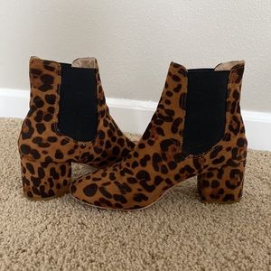 Faux fur heeled leopard boots. In great condition, purchased from a consignment store and worn a couple times. No brand found on the boots. I’m a size 7 and these fit comfortably with socks, shoes say 38 on the bottom (equivalent to a 7.5). Heel is 2 inches tall.