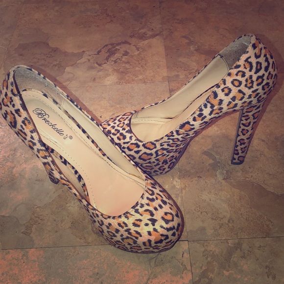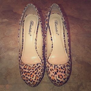 Leopard faux suede. Round toe thick heel. Worn, shows on bottom, shoe in good condition. Original box.