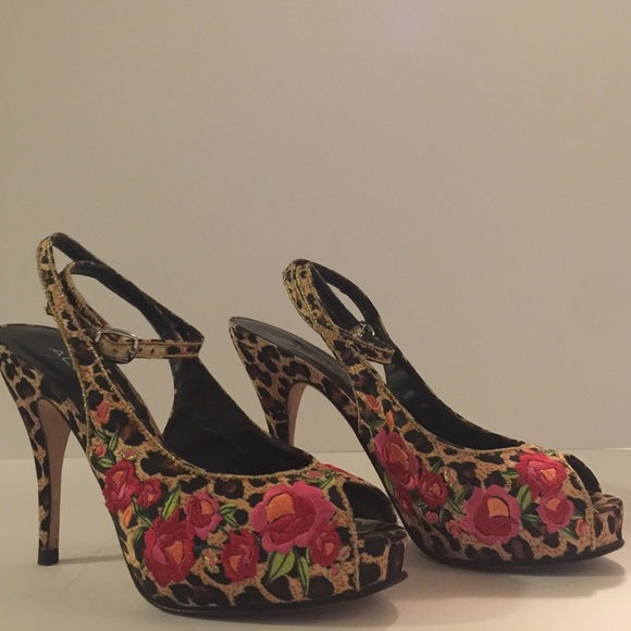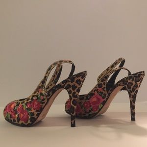 Leopard heels with embroidered red flowers. Ankle strap with gold buckle. Heel is 4 1/4. Platform is 3/4 of an inch. In great condition