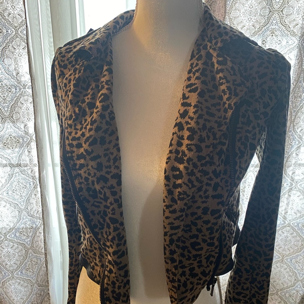 Leopard jacket with bronze zipper, leatherette accents on the sleeves and lower portion of the jacket. I have never worn it zippered. I usually left it open with a blouse underneath. Jacket is meant to be a bit of a cropped style. I bought this from a boutique called “Dry Goods”