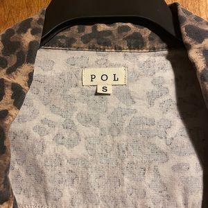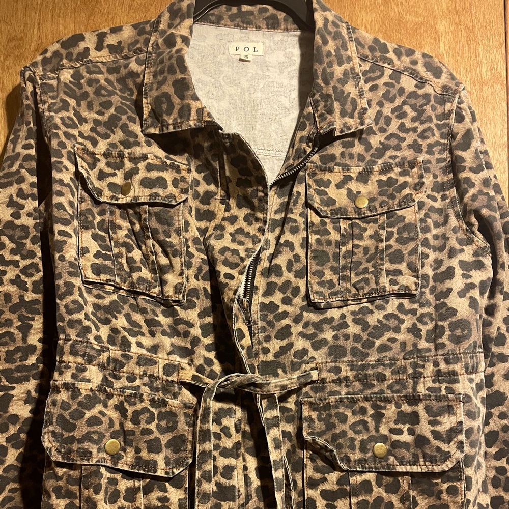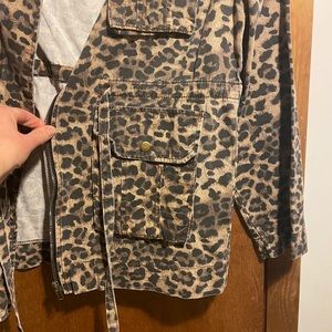 Light weight lightly distressed leopard jacket. Zipper front with tie waist. This jacket is brand new and never been worn. There is some light distressing on each sleeve and one spot on the back. Functional pockets. It runs a bit big for a small and is the only reason I am selling it. It’s a beautiful jacket, great for layering as well.