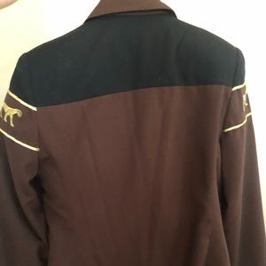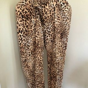 Leopard print pant (98% cotton) with gold woven leopard design jacket in brown with black shoulder accent