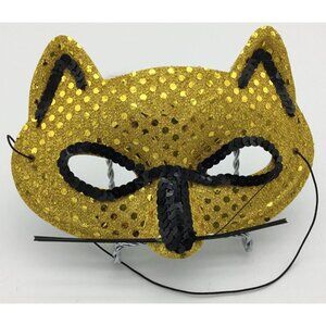 MASK: Half face, gold sequin fabric with black sequin details around the ears, nose and eyes. Plastic whiskers and elastic back headband
