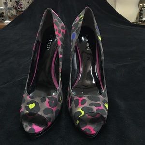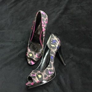 Fun leopard peep toe have a 4" heel and 1/2" platform! Leopard is black and brown with fuchsia, neon yellow and electric blue details! Worn one time! True to size!