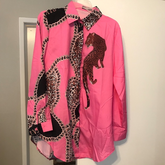Beautiful hot pink leopard blouse. New, never worn as it says medium, but true fit is a small.