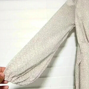 Great for a young girl! Light beige sheer lined dress. Long sleeves, shirred back.