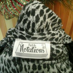 This is a very cute leopard print blouse with button detail on either shoulder. Elastic at the waist and also on the arms, insure a perfect fit! Blouse is 100% polyester / machine washable removable shoulder pads. Missing one button on right side in picture 3. Standard black button can be easily found and replaced. Otherwise in excellent condition! No size on tag but would fit a Small or Medium.