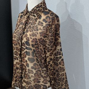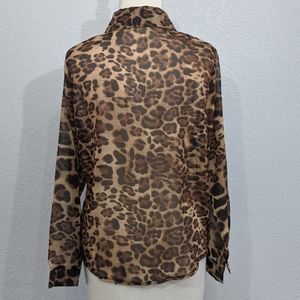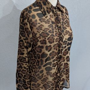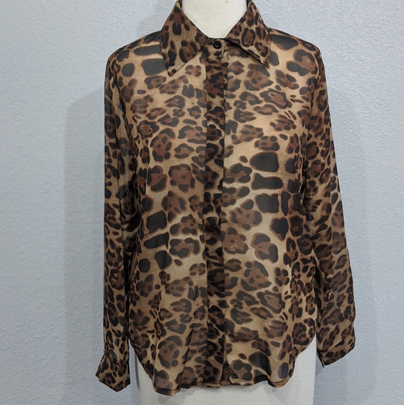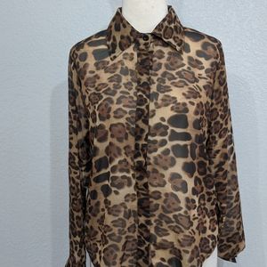 This sheer leopard print button down pairs perfectly with a black leather skirt. It has long sleeves with buttons at the wrist. The size is listed as a large, but it runs a little small and fits like a medium. That's why I have it marked medium.