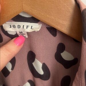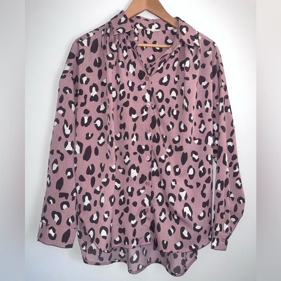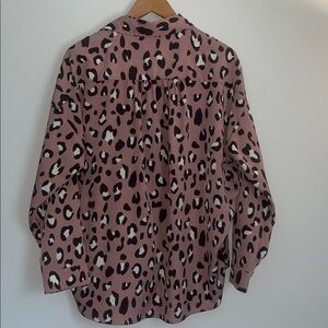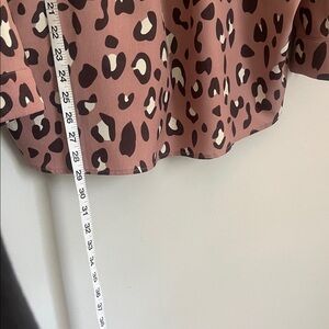 Super trendy. Pink, brown, cream. True to size. No flaws. Pit to pit 25”