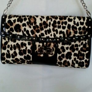 White House Black Market leopard print handbag has a separate place for a cell phone, Shell is 55% Calf Hair Leather, great condition.