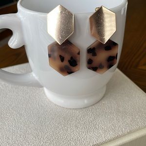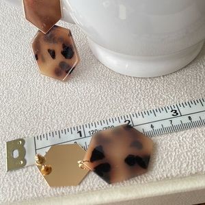 Leopard print marble and gold hexagon shape drop earrings. 2.5 inches in length.