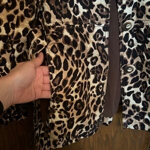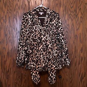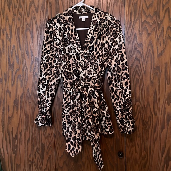 Cute leopard print jacket. Lightweight. Three large buttons for the front closure along with a matching wide tie belt. Button detail on the shoulders. Side seam pockets. Interior lining is solid brown.