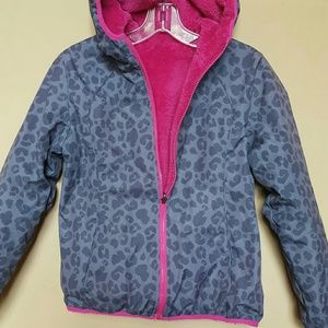 Great reversible jacket in a fun print. Waterproof Leopard print on one side and hot pink fleece fur on the other side. It's like two coats in one. NOTE that the zipper works fine but the original pull is missing so I added one, which is why I priced this low.. size XS (2) or Youth 14