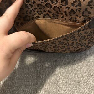 Chic and roomy shoulder bag in a bold leopard print canvas with black leather trim accents. Perfect for adding a pop of style to any outfit while keeping things functional.