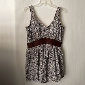 Super cute one piece leopard print swim dress / one piece swimsuit. Built in shelf bra with molded padded cups for extra support, flattering tummy control lining in the front, empire banding in chocolate brown at the waist cinches you in and accents your curves, V-Neck. Gently worn in clean condition, free of snags with some wrinkling of the elastic inside the straps and neckline - they still are stretchy, however, and some loose threads in the front at the empire banding (see last pic) - doesn't affect wear and seam is still intact from underneath. Colors are brown, black and cream. This is such a cute suit - a Pin Up Girl style!