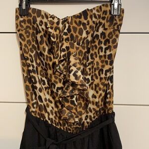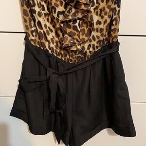 Fashionable romper, leopard print on top half with ruffles. Pull on. No closures. Elastic top, does tie! Side pockets! Great condition!