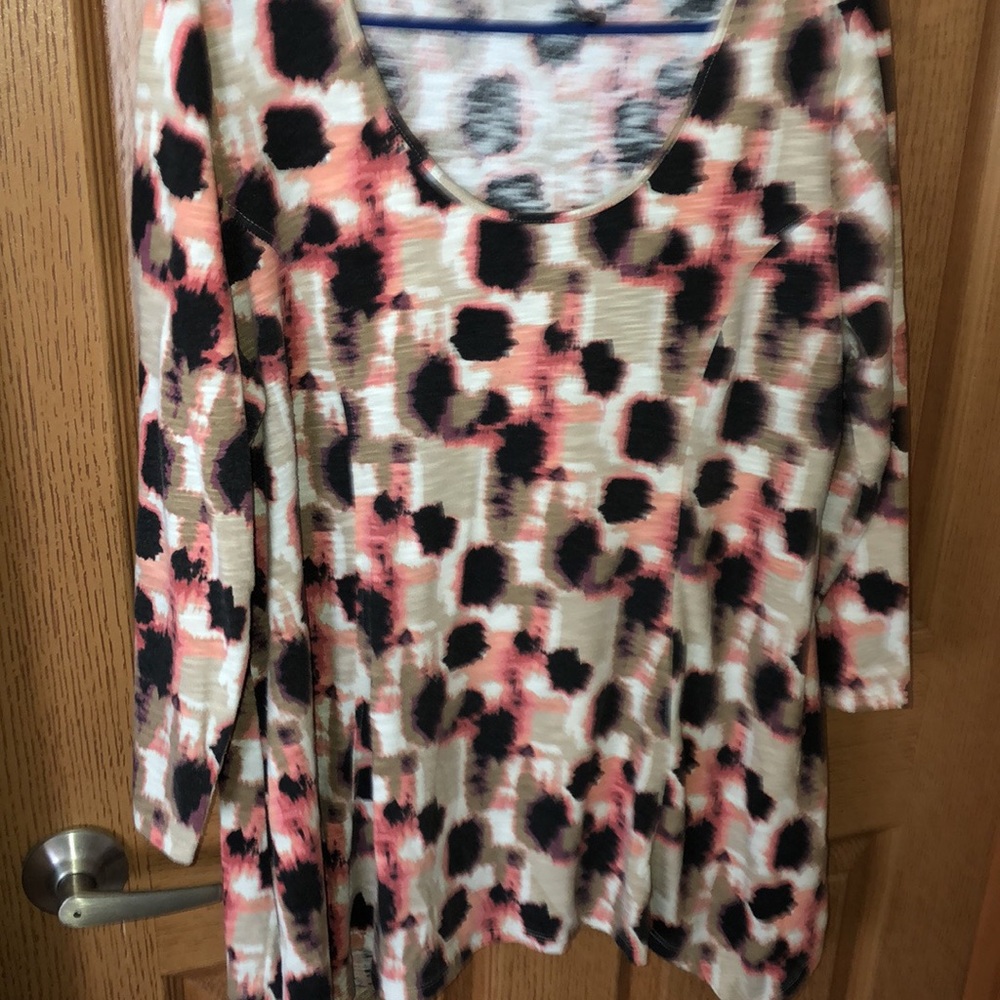 Multi colored leopard block top w 3/4 sleeves and detailed curve in front and back. Shark bite tails