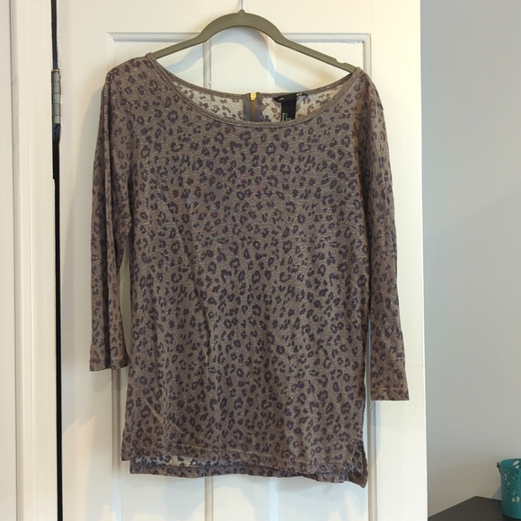 Gray and black leopard print quarter sleeve top with back zip