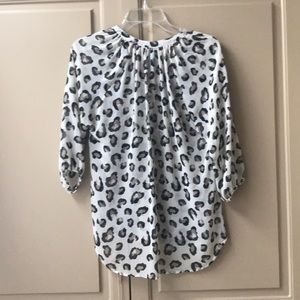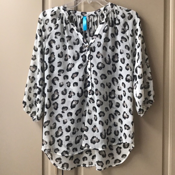 Semi sheer. Three quarter sleeves. High low hem measures 28” long