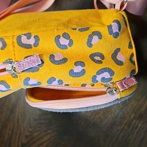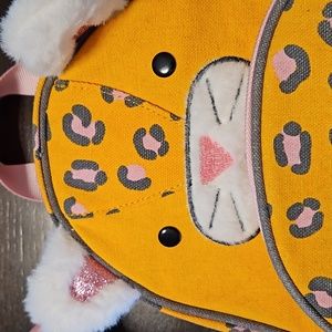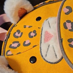Main color is a yellow orange with pink, white, and gray accents. White fur and pink glitter details. Button eyes.