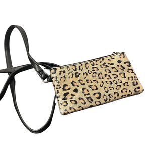 Metallic leopard crossbody, zip closure, 2 slips where you can fit cards and essentials (including phone)
