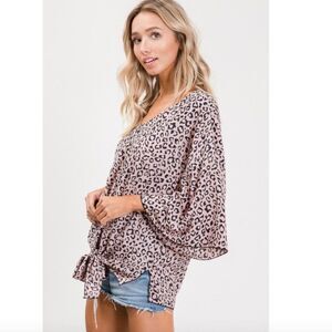 NWT– New with tags. V-neckline, long wide sleeves, tie front detail at front hem. Allover leopard print, animal print. Side split hems.