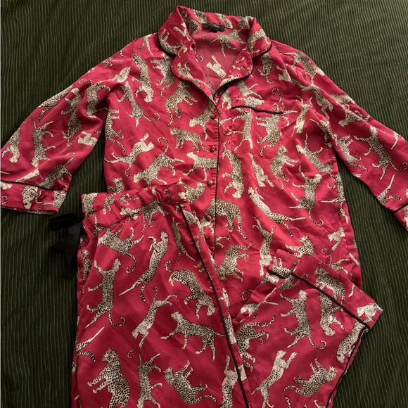 Two-piece pajama set with playful leopard / cheetah pattern. Satin-like sheen fabric for a smooth feel. Button-front top with piped trim. Elastic waist pants with drawstring. Classic lounge style for bedtime or play.