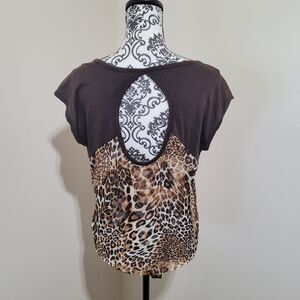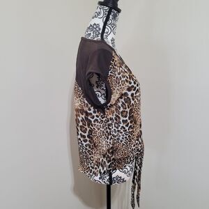 Stylish leopard print top for women, perfect for a chic and trendy look. Features a comfortable fit and eye-catching design. Made with polyester, rayon and spandex materials. Lightweight. Sheer so needs a cami. Excellent condition. Tag says size xlarge.