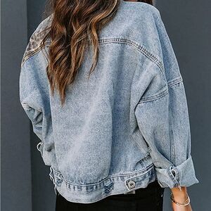 Leopard print denim jacket. Patchwork design, relaxed fit, cropped, comfortable, and versatile for every occasion.