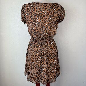 Super fun midi dress measuring 18 inches armpit to armpit laying flat, 14 inches at the stretch fit waist, and 34 inches in length from shoulder to hem.