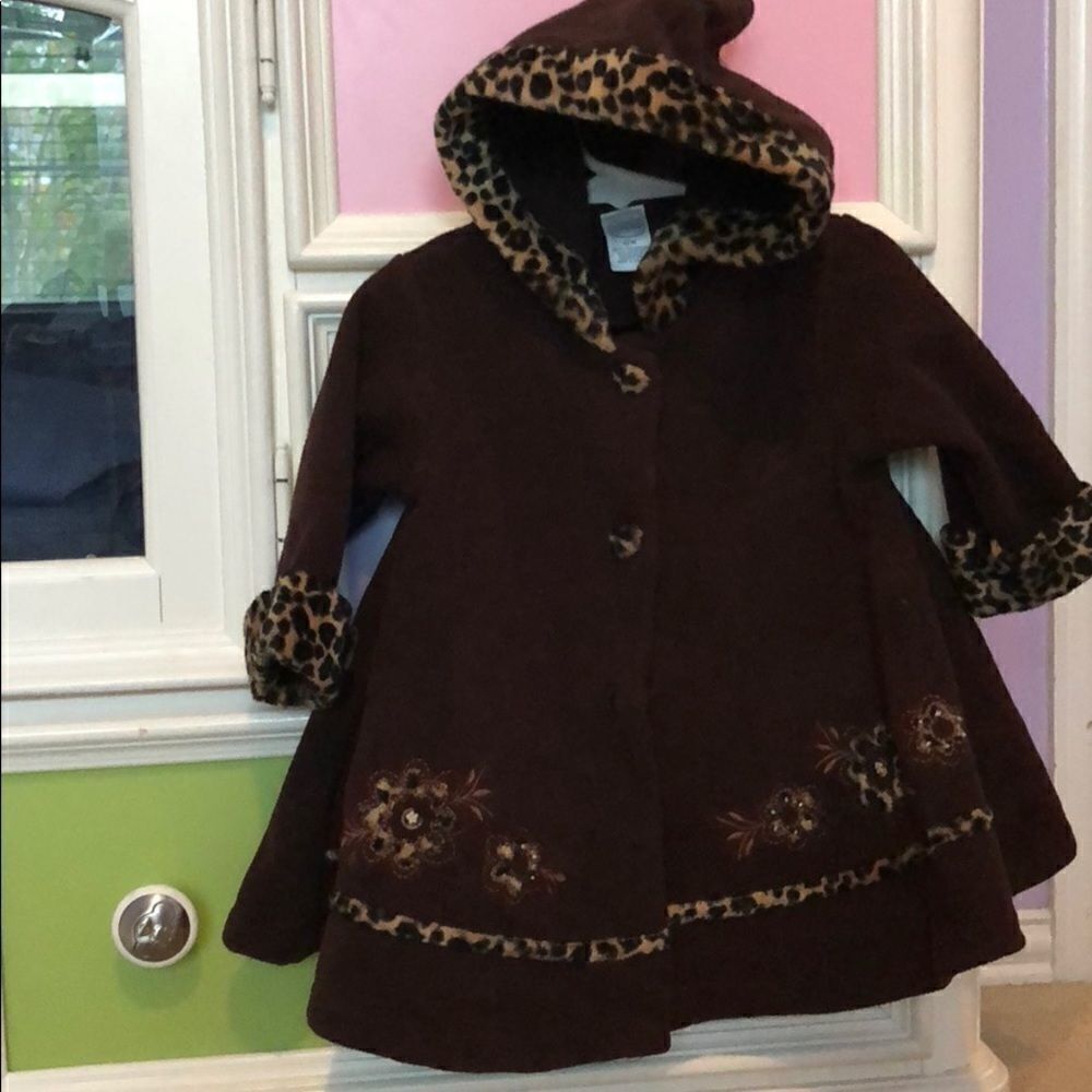 It is a cute Leopard print jacket on the Hoodie, sleeves, and buttons. Barely used. Great condition.