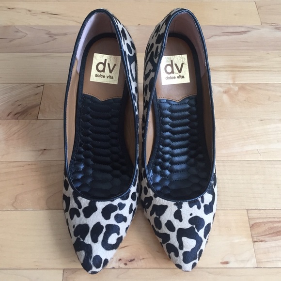 Gently worn heels in leopard-print calf hairs. Heels are 3.5" high. Great for a day or night out.