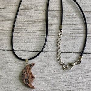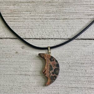 Leopardskin Jasper Carved Crescent Moon with Face Pendant Necklace.