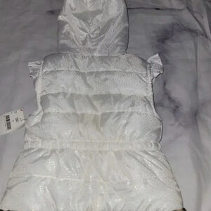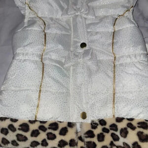 This is such an adorable fun girls size 6 puffer type vest! Perfect for fall, winter, cold vacation destinations or chilly days! New with tags!! Its white with leopard print around hood and bottom! SF/PF