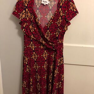 Vibrant floral pattern. Short sleeves. Wrap style. Perfect for any occasion. 17.5" pit to pit, 14.5" waist, 36" length