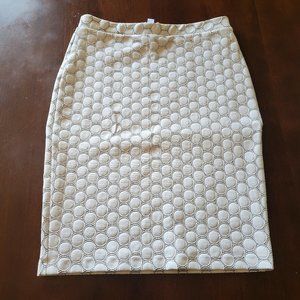 Leota Tabitha pull-on style pencil skirt. Very cute paired with a fitted top and a jean jacket, washes well. White with black circle pattern.