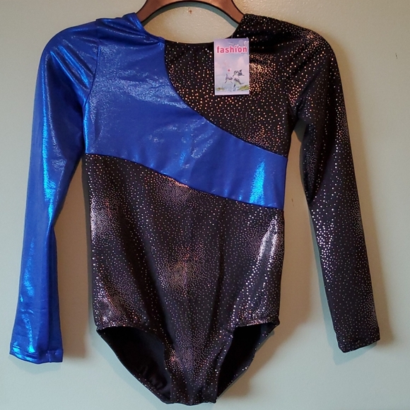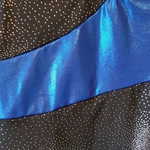 Shiny royal blue with black sparkly material. Brand new with tag. Recital was canceled last yr due to covid so this was never used.